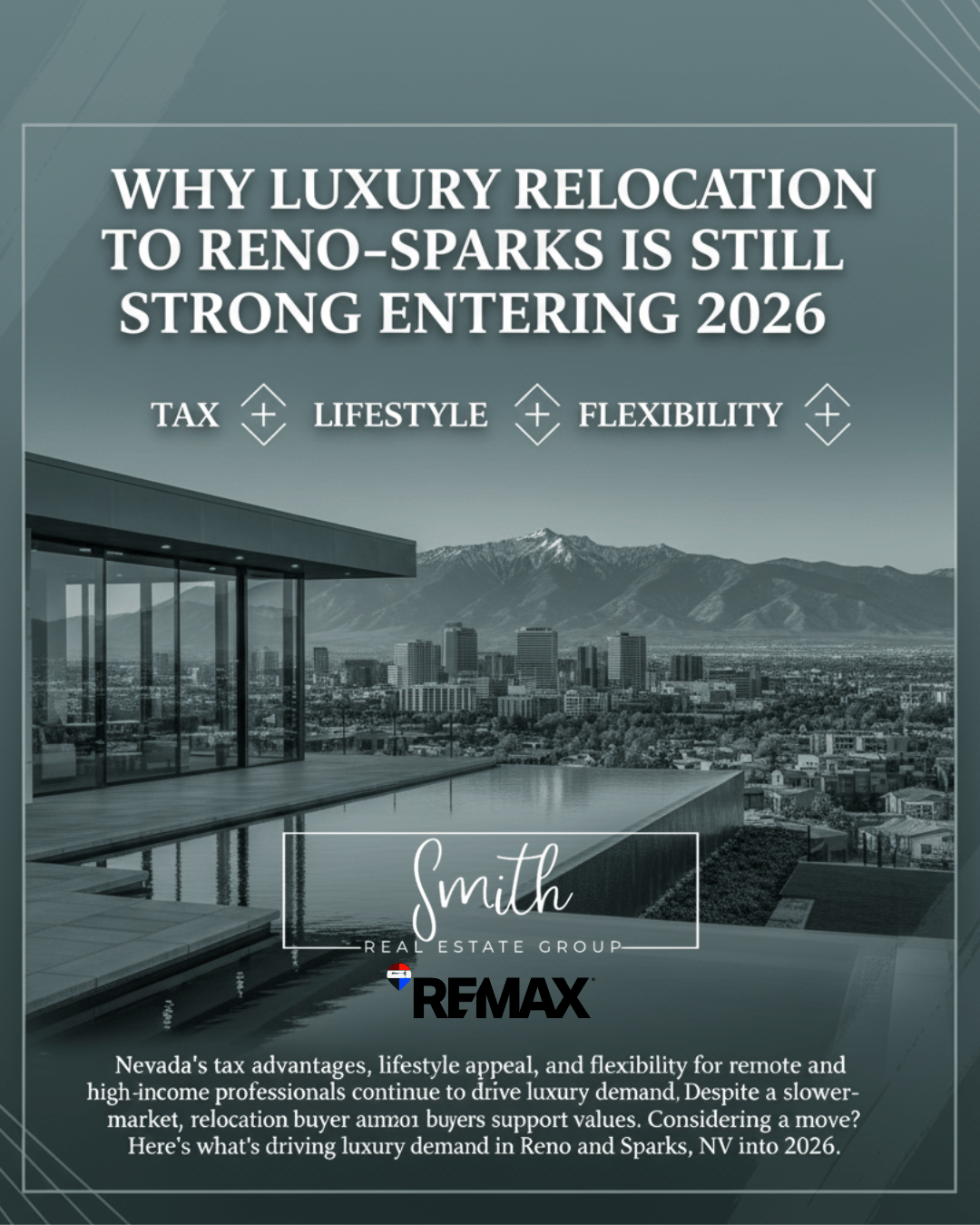 The Smith Real Estate Group with RE/MAX Professionals, one of the Top 25 MLS teams in Northern Nevada, specializes in luxury relocation strategy, pricing, and marketing.